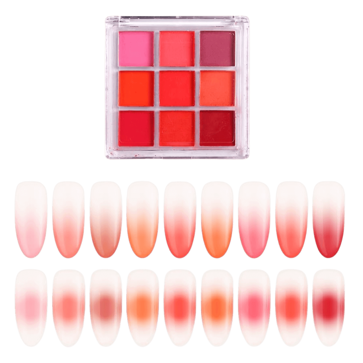 Palette de 9 pigments aux teintes rose rouge et orangées, parfaites pour créer des dégradés, des effets ombrés et les tendances aura nails. Application facile avec fini professionnel.